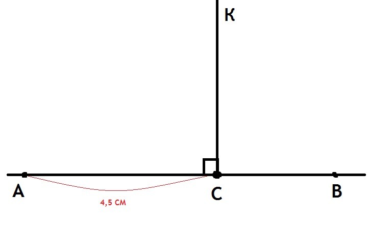 1. Начертите прямую АВ на прямой отметьте отрезок АС=4 см5 мм. Через точку С проведите луч СК перпендикулярный отрезку АС.