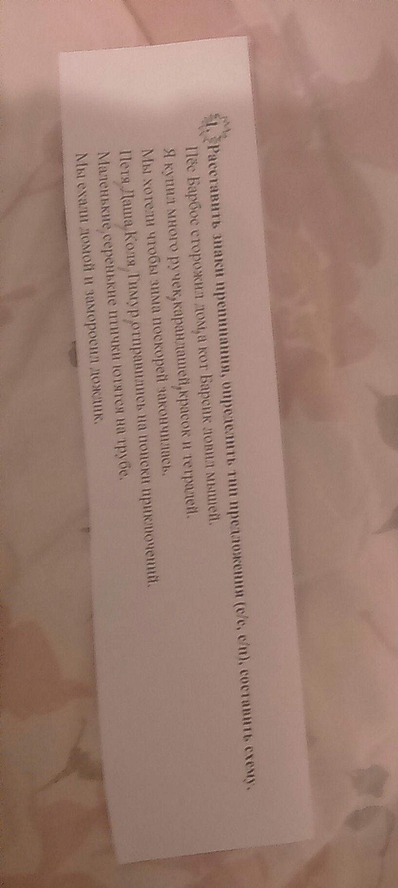 Пёс Барбос сторожил дом, а кот Барсик ловил мышей. Я купил много ручек, карандашей, красок и тетрадей. Мы хотели чтоб зима поскорее закончилась. Петя, Даша, Коля, Тимур отправились на поиски приключений. Маленькие, серенькие птички ютятся на трубе. Мы ехали домой и заморосил дождик.
