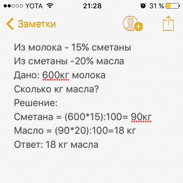 Из молоко можно получить 15% сметаны, из сметаны -20% масла. Сколько масла можно получить из 600 кг. молока? (Задачу написалала слвово в слово, как из книги. Все кг тоже как в книге) Прошу помочь, зарание Спасибо!☺