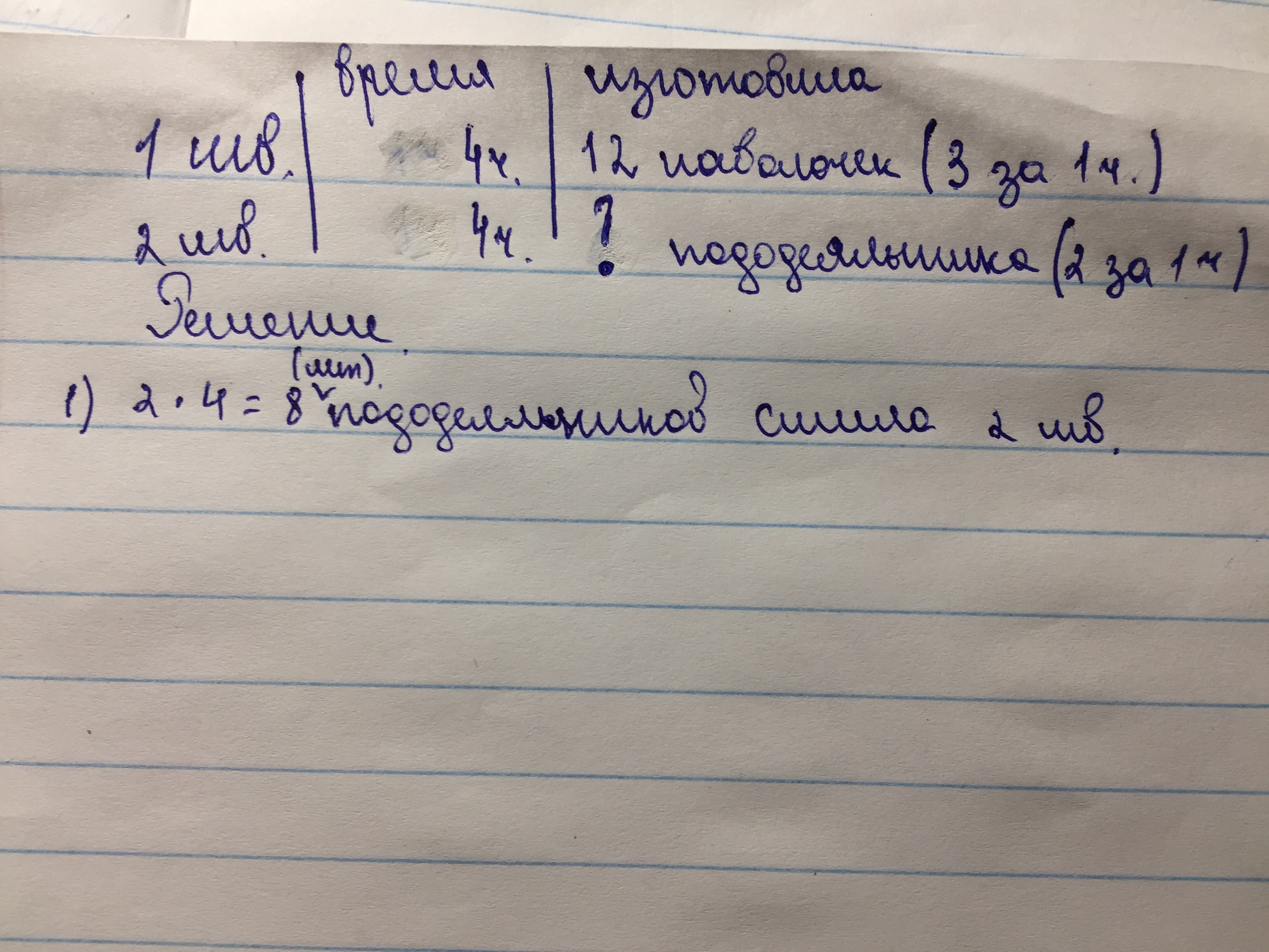 Помогите! Сделайте условие к задаче в таблицу: Две швеи работали одинаковое время. Первая швея сшила за это время 12 наволочек, по 3 наволочки за час. Сколько пододеяльников сшила за это время вторая швея, если каждый час она шила по два пододеяльника?