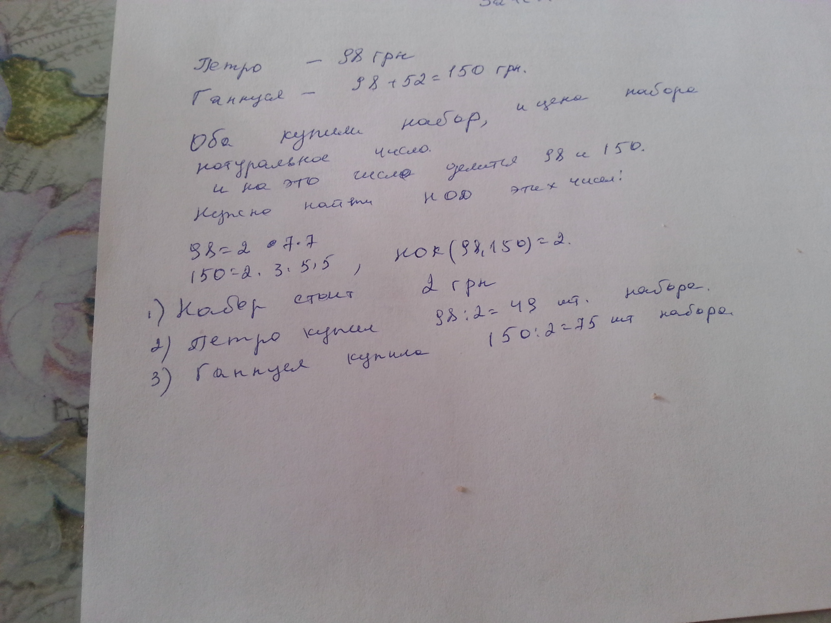 Петро та Ганнуся купили однакові набори наклейок із зображеннями риб та птахів. Ціна набору виражена цілим числом гривень. Петро заплатив за покупку 98 грн, а Гануся - 52 грн більше. Скільки коштує один набір? Скільки наборів купив Петро? Скільки наборів купила Ганнуся?