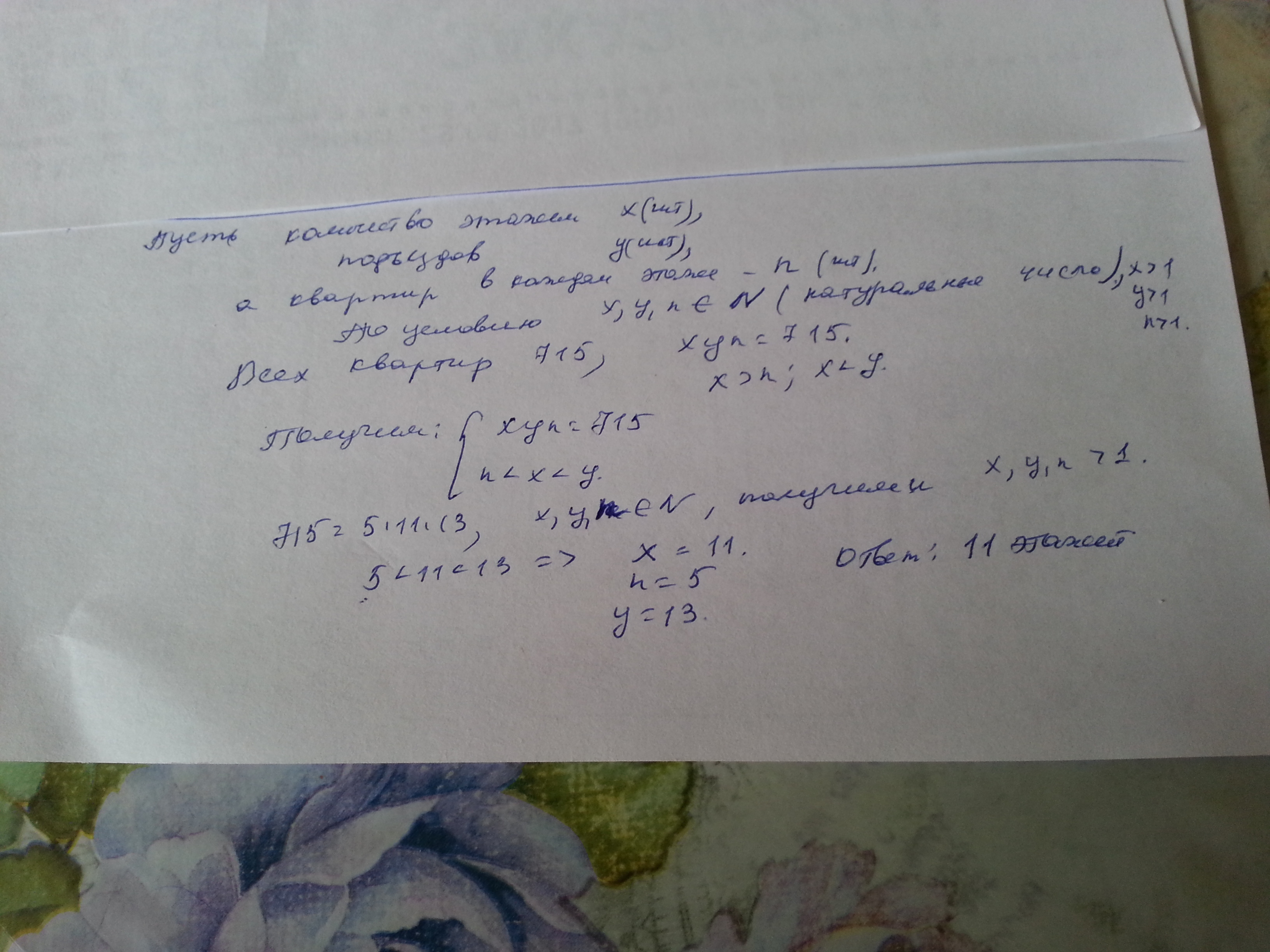 в дома на всех этажей во всех подъездах равное количество квартир. Также во всех подъездах поровно этажей. При этом количество этажей больше количества квартир на этаже, но меньше чем количество подъездов. Сколько в доме этажей если всего квартир 715?