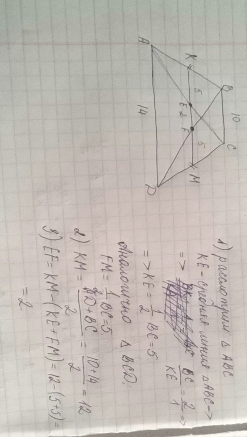 основания равнобокой трапеции равны 10см и 14см найти длины отрезков на которые средняя линия делится на диагонали трапеций