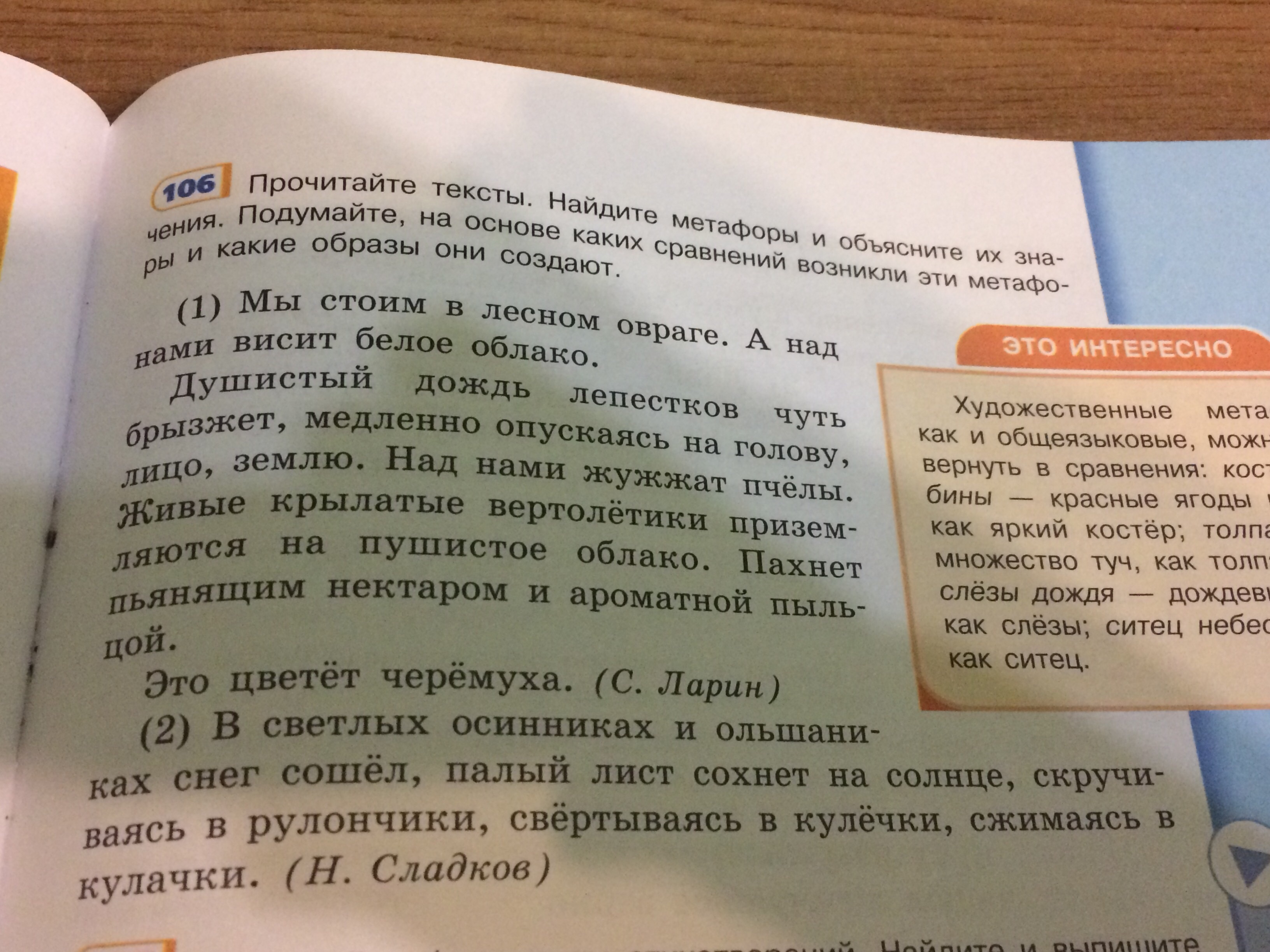 метафоры из 1-го текста: облако висит, дождь лепестков, живые вертолётики.