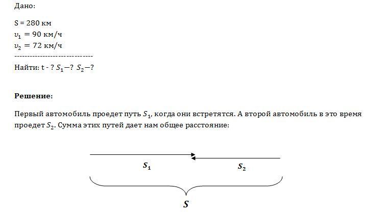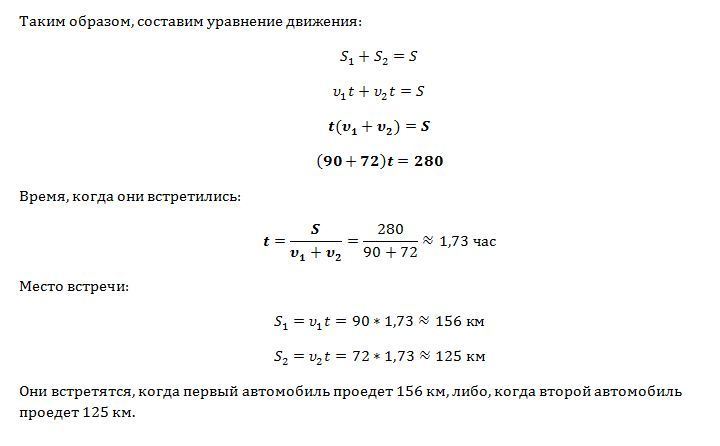 Расстояние между городами равно 280 км. Из этих городов начали одновременно двигаться навстречу друг другу два автомобиля - первый со скоростью 90 км/ч, а второй со скоростью 72 км/ч. Напишите уравнения движения автомобилей. Определите время и место их встречи.