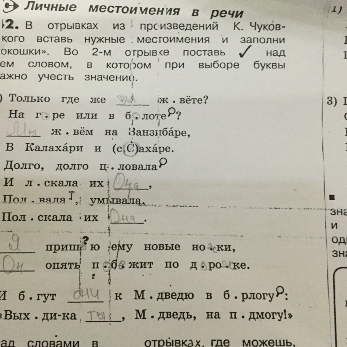 Где - местоимение, же - частица, вы - местоимение, живёте - глагол, на - предлог, горе - существительное, в - предлог, болоте - существительное, мы - местоимение, живём - глагол. на - предлог, Занзибаре - существительное, в - предлог, Калахари - существительное, Сахаре - существительное, долго - наречие, целовала - глагол, и - предлог, ласкала - глагол, их - местоимение, она - местоимение