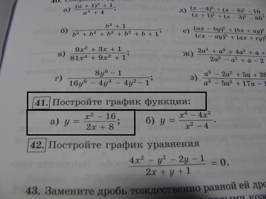 у = (х*х -16)/(2х+8) = (х-4)*(х+4)/2(х+4) = 0,5х - 2 , х+4#0