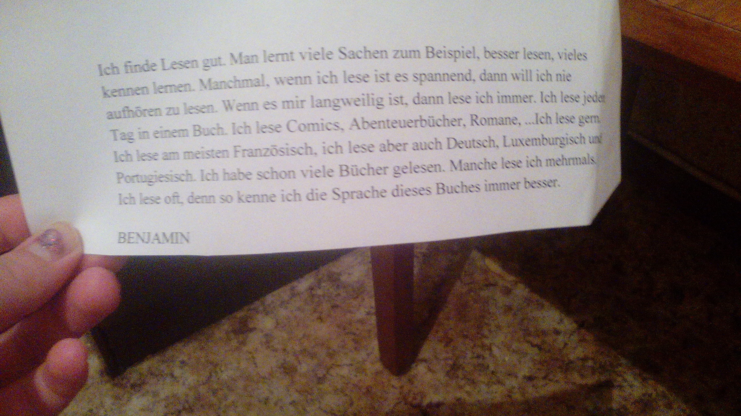 Я считаю, что читать это хорошо. Учишься многому новому, например, лучше читать, многое узнавать. Иногда, за чтением, тебя так захватывает, что хочешь, чтобы чтение никогда не заканчивалось. когда мне скучно, я всегда читаю. я читаю каждый день какую-нибудь книгу. Читаю комиксы, книги о приключениях, романы. я читаю с удовольствием. В основном, читаю на французском. Также, читаю на немецком, люксембургском и португальском. Я прочитал уже много книг. Многие перечитываю несколько раз. Я читаю часто, так я лучше изучаю языки, на которых эт книги написаны.