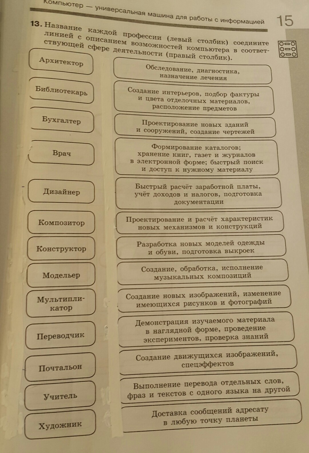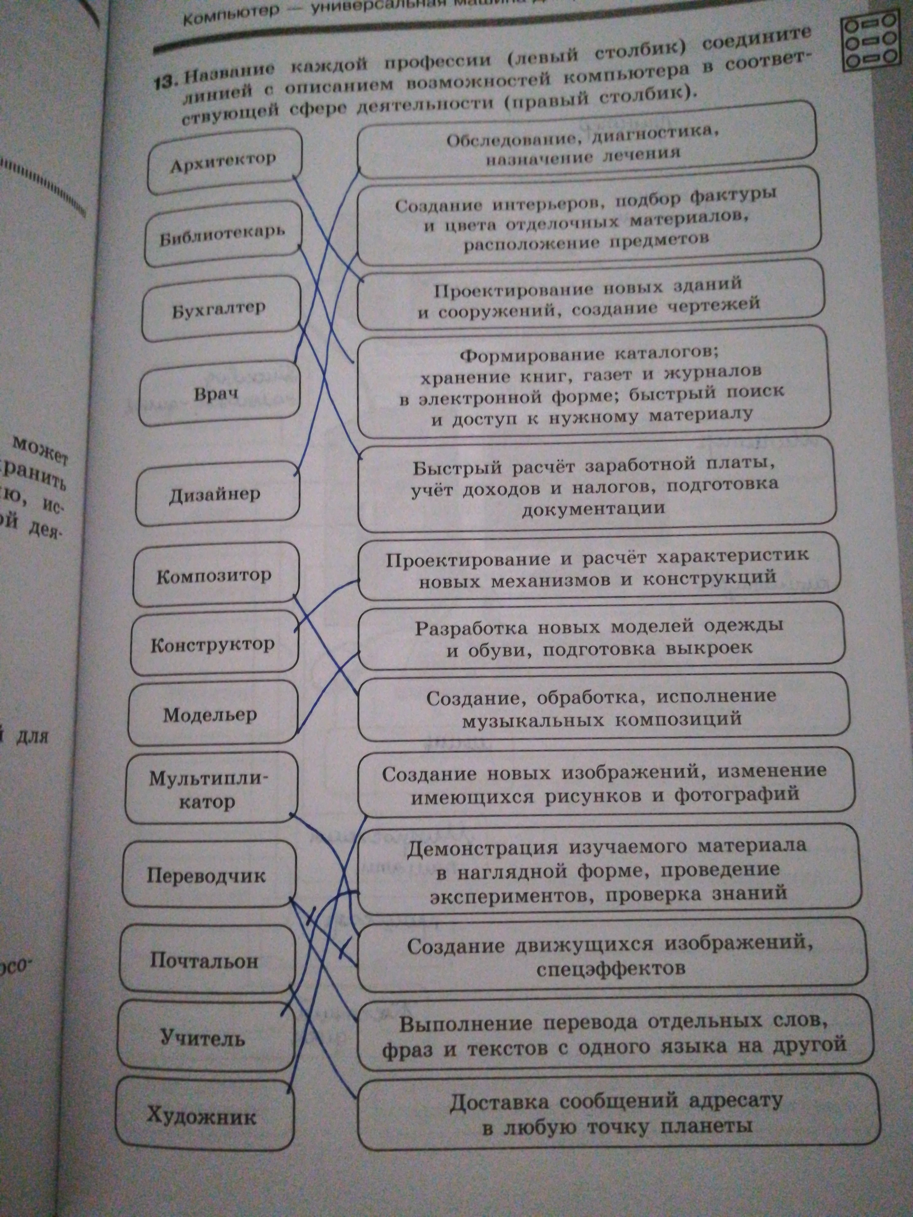 название каждой профессии левый столбик соедините линией с описанием возможностей компьютера в соответствующей сфере деятельности правый столбик