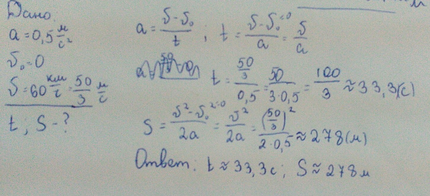 Поезд отошёл от станции с ускорением 0,5м/с^2. За какое время он достигнет скорости 60 км/ч? Какой путь пройдёт поезд за это время?