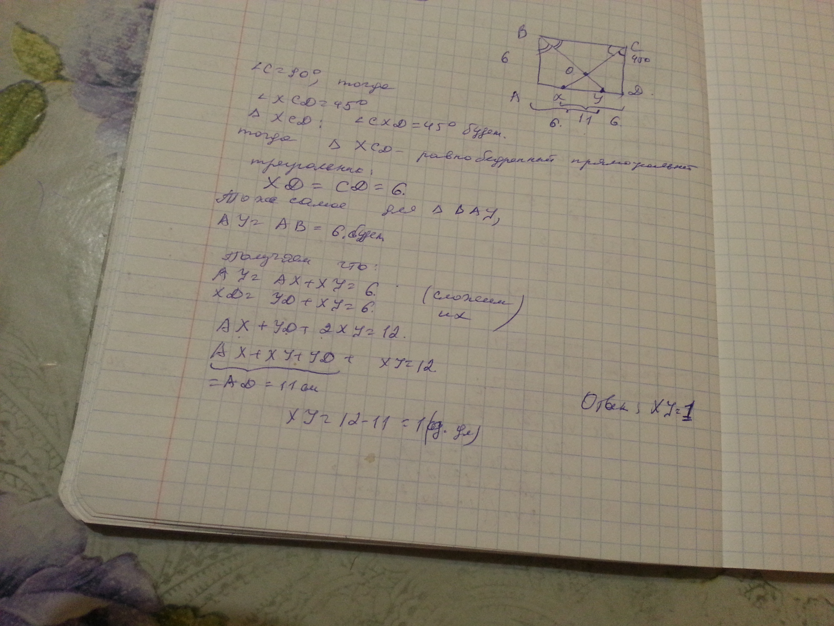 В прямоугольнике ABCD сторона AB равна 6 сторона BC равна 11 см. Из вершины B и C проведены биссектрисы углов, пересекающая сторону AD в точках X и Y соответственно. Найдите длину отрезка X Y.