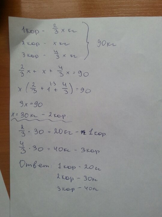 вес 1 коробки составляет 2/3 от веса второй и 50% от третьей. сколько кг весит каждая, если вместе они весят 90кг.? Помогите решить задачу, пожалуйста.