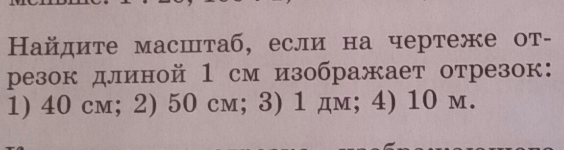 1) Вычислим масштаб если отрезок на чертеже в 1 см изображает 40 см. 40 / 1 = 40. Ответ: 1:40. 2) Вычислим масштаб если отрезок на чертеже в 1 см изображает 50 см. 50/1 = 50. Ответ: 1: 50. 3) Вычислим масштаб если отрезок на чертеже в 1 см изображает 1 дм. 1 дм = 10 см. 10 / 1 = 10 Ответ: 1:10. 4) Вычислим масштаб если отрезок на чертеже в 1 см изображает 10 м. 1 м = 100 см, 10 м = 1000 см. 1000 / 1 = 1000. Ответ: 1: 1000.
