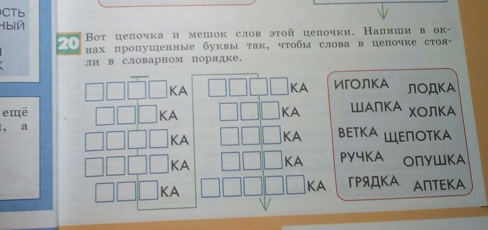 Вот цепочка и мешок слов этой цепочки. Напиши в окнах пропущенные буквы так, чтобы слова в цепочке стояли в словарном порядке