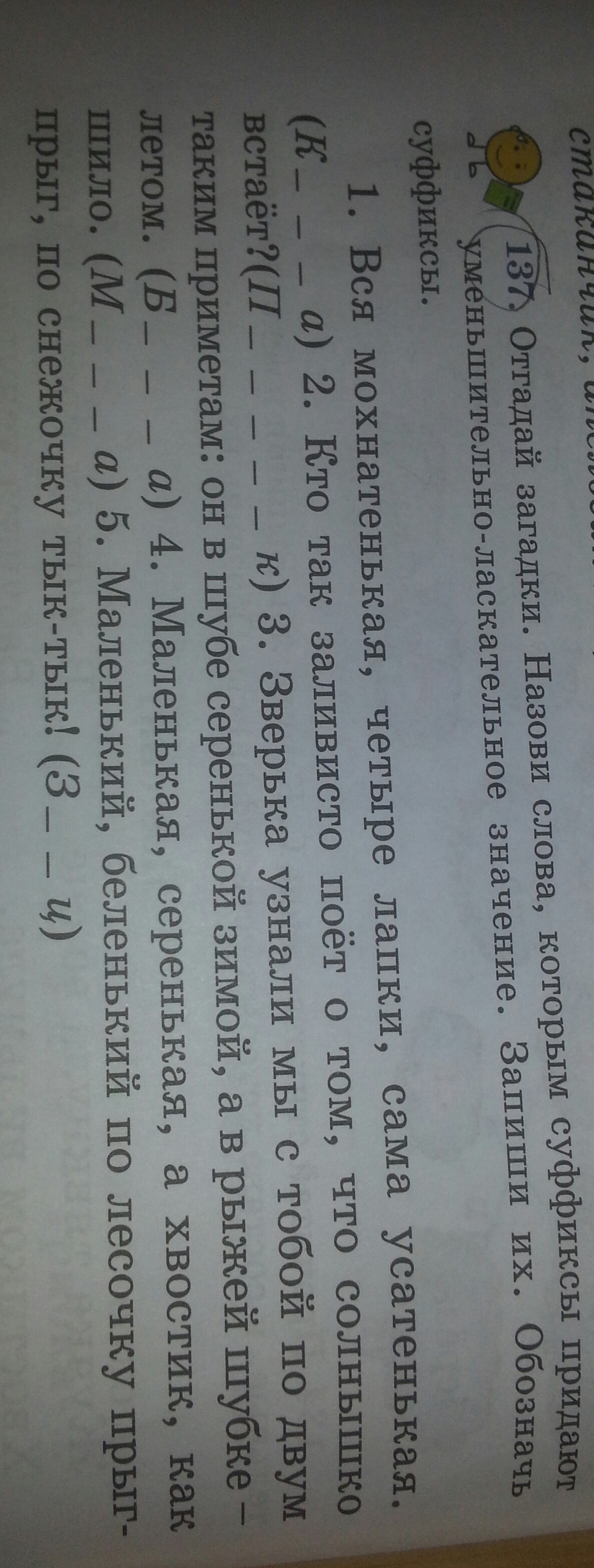 Отгадай загадки. Назови слова,которым суффиксы придают уменьшительно-ласкательное значение. Запиши их.Обозначь суффиксы.