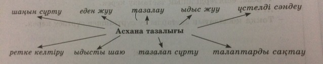 Асхана тазалыгы ушын асхананы тазалап туру керек .Мысалы ыдыс жу керек,шанды тазалап сурту ,еден жу керек. Талаптарды устау керек.Асхананы тазалыкта устау керек