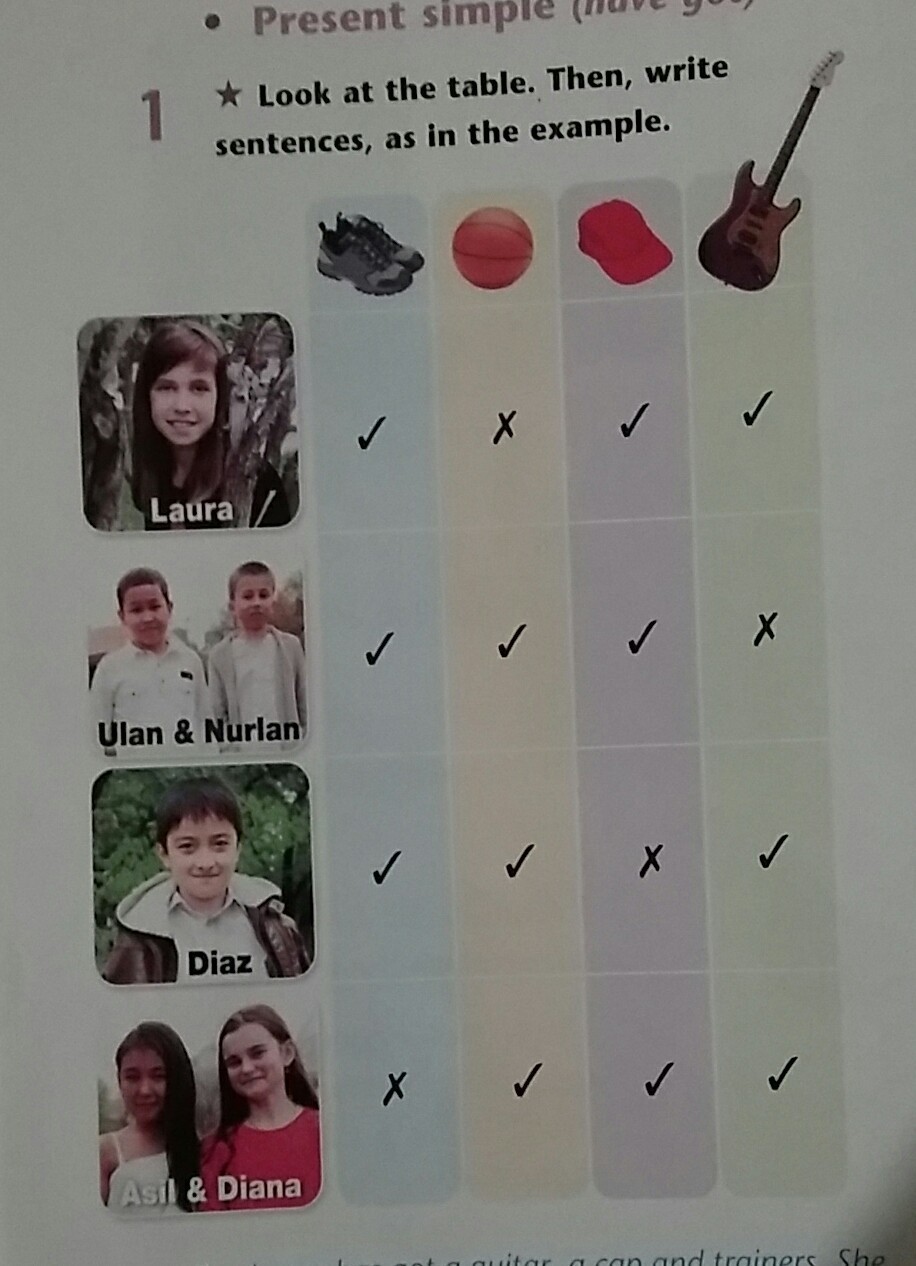 Ulan and Nurlan have got shoes, a hat and a ball. They haven't got a guitar.