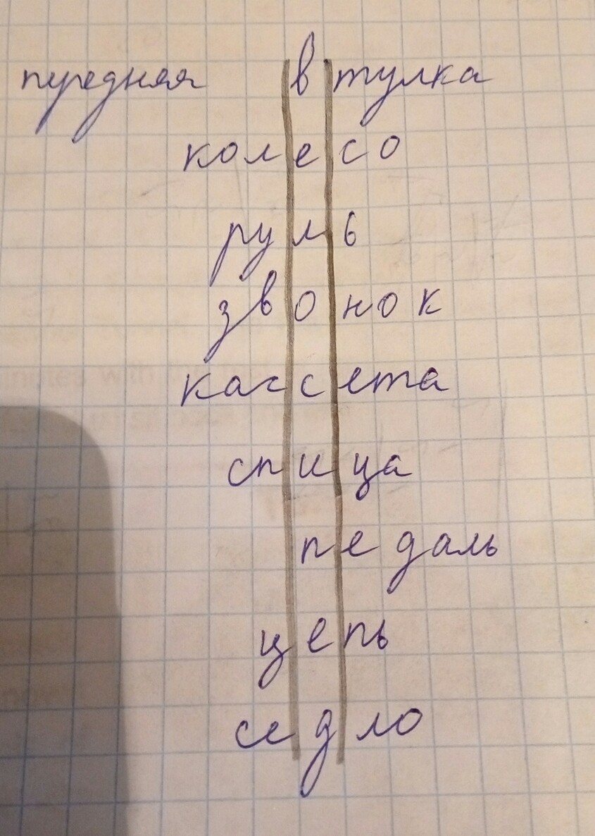 Ребята помогите пожалуйста составить кроссворд!!!!!!!!!Например:звонок.колесо,руль,тормоз,насос,спица,цепь,педаль,седло.По середине слово велосипед!!!!Получается все что находится на велосипеде!!!!!!!!СРОЧНО НУЖНО!!!!!!!Если нравится даю "правильное решение"20 баллов!!!!!!!!!!!!!!!!!!!!!!!!