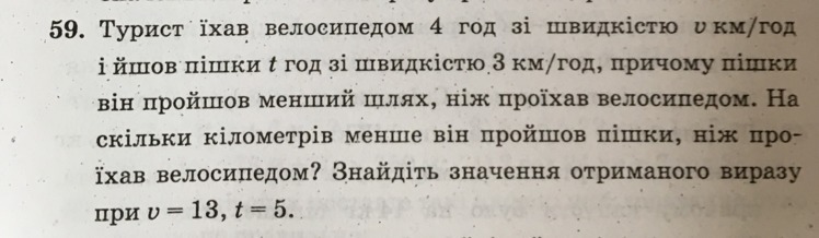 Велосепедом : V - 13 км/год, T - 4 год, S - ?
