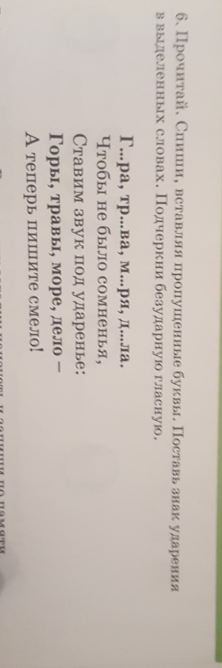 ГОра(гОры),трАва(трАвы),мОря(мОре),дЕла (дЕло).В первой строчке ударение во всех словах на последний слог(-а,-я).В предпоследней строке ударение на первый слог(-о,-а,-е)
