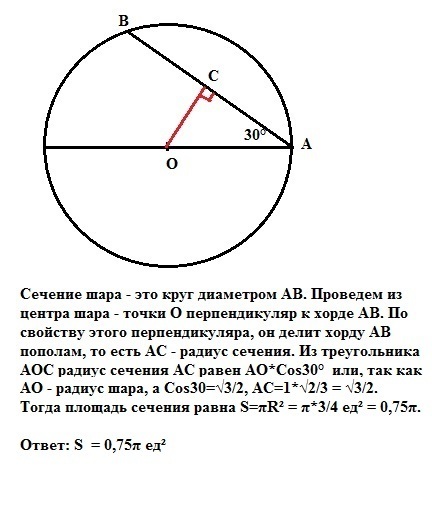 Искомое сечение шара - это круг диаметром АВ, наклоненным к диаметру шара под углом 30° (дано). Проведем из центра шара перпендикуляр ОС к хорде АВ. По свойству этого перпендикуляра он делит хорду АВ пополам, то есть АС - радиус сечения. Из прямоугольного треугольника АОС радиус АС равен АО*Cos30 или, так как АО - радиус шара, а Cos30=√3/2, АС=1*√2/3 = √3/2. Тогда площадь сечения равна S=πR² = π*3/4 ед² = 0,75π.