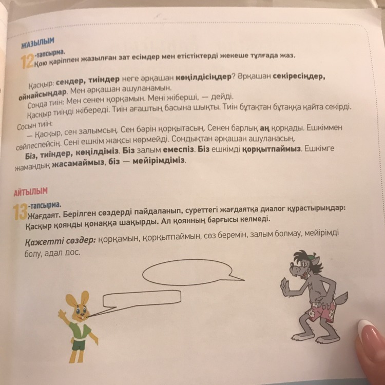 Сендер-сен, тиіндер-тиін, көңілдісіңдер-көңілді, секіресіңдер-секіреді, ойнайсыңдар-ойнайды, біз-мен, көңілдіміз-көңілдімін, емеспіз-емеспін, қорқытпаймыз-қорқытпаймын, жасамаймыз-жасамаймын, мейірімдіміз-мейірімдімін