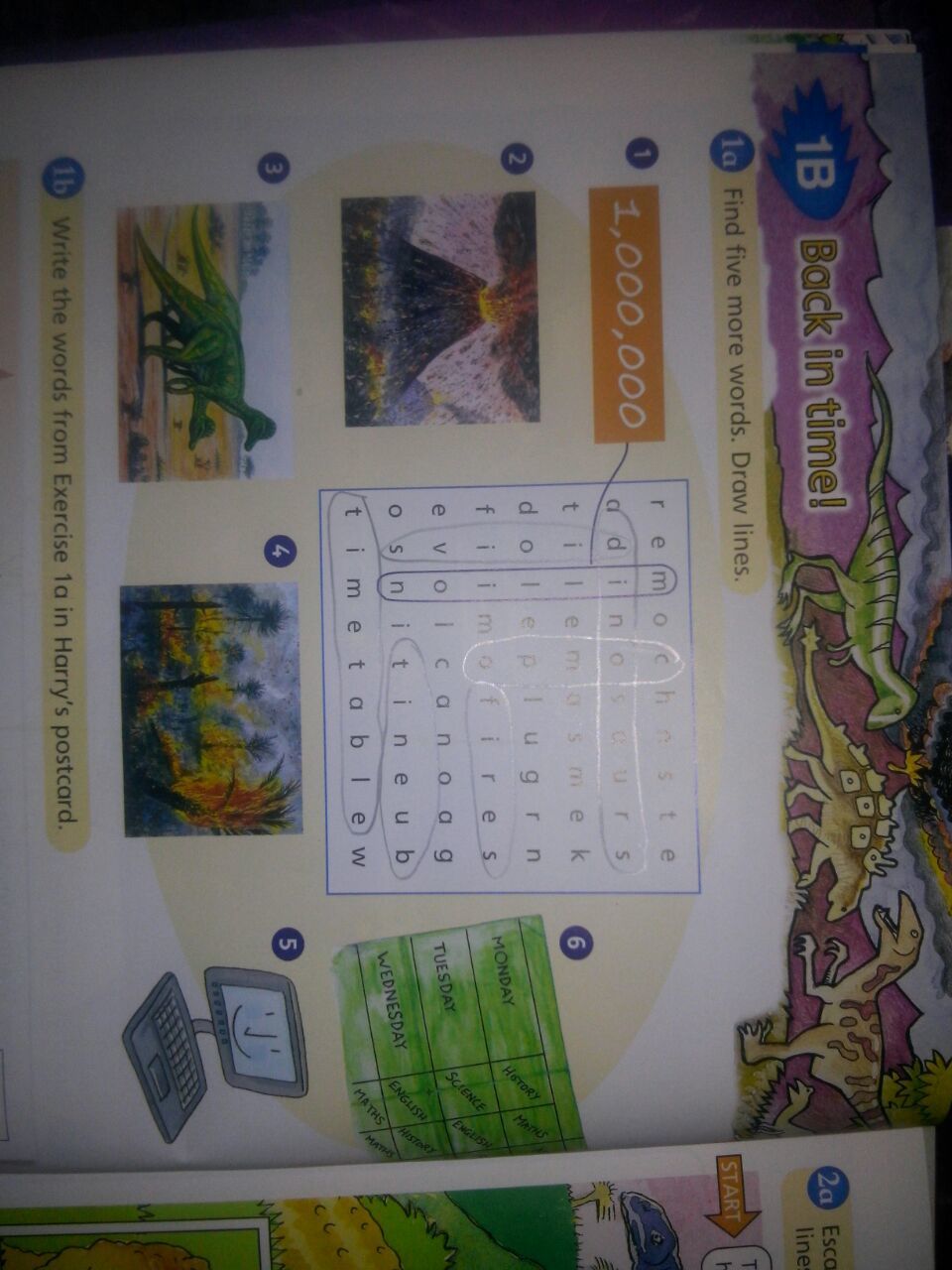Сотрите все ластиком и обводите эти слова volcano timetable dinosaurs fire. А слова TINEUB и COMPO таких слов нет в Англ.языке