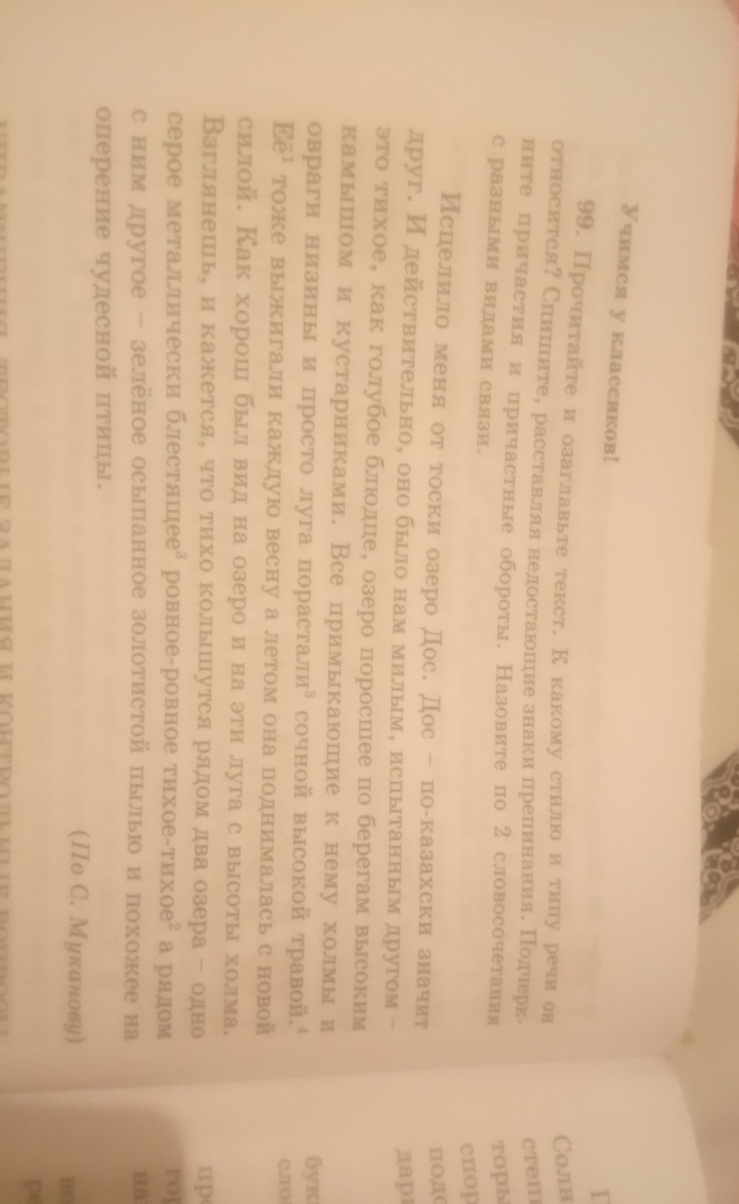 ОЗЕРО ДОС; ОЗЕРО - МИЛЫЙ ДРУГ; ОЗЕРО, ИСЦЕЛЯЮЩЕЕ ОТ ТОСКИ (Художественный стиль, описание) Исцелило меня от тоски озеро. И действительно, оно было нам милым, {испытанным} другом – это тихое, как голубое блюдце, озеро, |поросшее по берегам высоким камышом и кустарниками|. Все |примыкающие к нему| холмы и овраги, низины и просто луга порастали сочной высокой травой. Её тоже выжигали каждую весну, а летом она поднималась с новой силой. Как хорош был вид на озеро и на эти луга с высоты холма. Взглянешь, и кажется, что тихо колышутся рядом два озера – одно серое, металлически блестящее, ровное – ровное, тихое – тихое, а рядом с ним другое – зелёное, |осыпанное золотистой пылью|, |и похожее на оперение чудесной птицы|. Золотистой пылью, высоким камышом - согласование Порастали травой, с высоты холма - управление