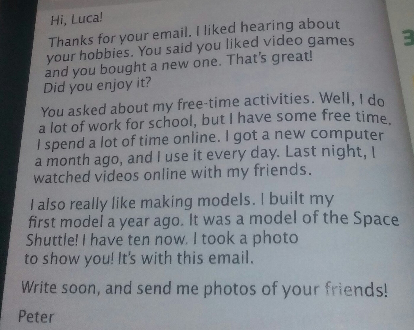 Привет, Лука! слыша о благодарности за ваш адрес электронной почты. Мне нравились игры в ваших увлечениях. Вы сказали, что вам понравилось видео, и вы купили новый. Замечательно! Вам понравилось? Ну, ты спрашивал о моей деятельности в свободное время. свободное время много работы школы, есть некоторые я провожу много времени в Интернете. Я получил новый компьютер месяц назад, и я использую его каждый день. Прошлой ночью. смотрел видео онлайн с моими друзьями. Мне также очень нравится создавать модели. Я построил свою первую модель год назад. Это была модель космического челнока! есть десять сейчас. Я сделал фотографию, чтобы показать вам! Это с этим электронным письмом. Напишите в ближайшее время и отправьте мне фотографии своих друзей! Питер