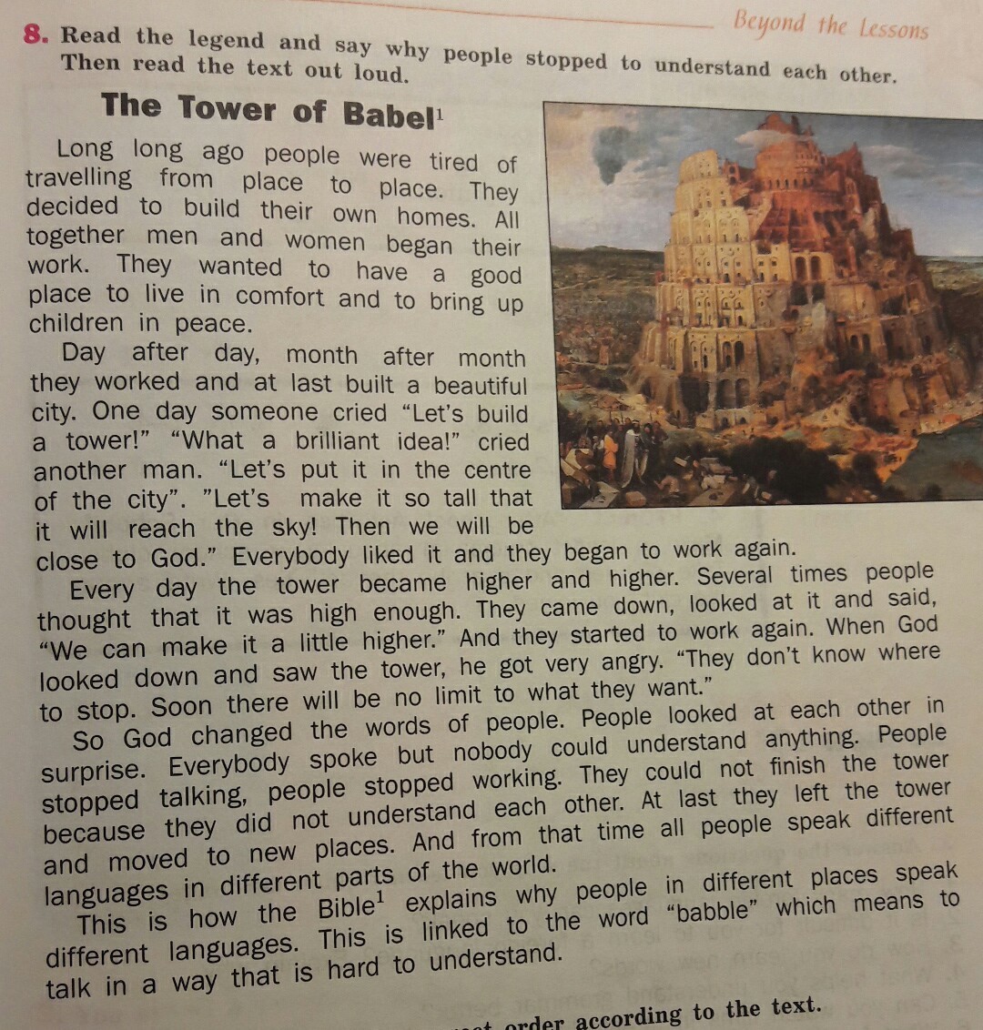 Вавилонская башня .Давным-давно люди устали путешествовать с места на место. Они решили построить собственные дома. мужчины и женщины начали свою работу. Они хотели иметь хорошее место, чтобы жить в комфорте и воспитывать детей в покое. День за днем, месяц за месяцем они работали и, наконец, построили красивый город. Однажды кто-то крикнул: «Давайте построим башню!» «Какая блестящая идея закричала другому человеку». Давайте поместим его в центр города «Давай сделаем его настолько высоким, что он достигнет неба! Тогда мы будем рядом с Богом». Всем понравилось, и они снова начали работать. Каждый день башня становилась все выше и выше. Несколько раз люди думали, что это достаточно высоко. Они спустились, посмотрели на него и сказали: «Мы можем сделать это немного выше». И они снова начали работать. Когда Бог посмотрел вниз и увидел башню, он очень рассердился. «Они не знают, где остановиться. Скоро не будет предела тому, чего они хотят. Так что Бог изменил слова людей. Люди смотрели друг на друга с удивлением. Все говорили, но никто ничего не мог понять. Люди перестали разговаривать, люди перестали работать, они не смогли закончить башню, потому что не понимали друг друга. Наконец они покинули башню и переехали в новые места. И с этого времени все люди говорят на разных языках в разных частях света. Библия объясняет, почему люди в разных местах Это связано со словом «болтовня», что означает разные языки. понимать. говорить трудно.