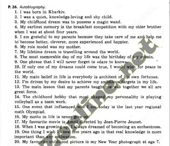 1. родился в Харькове.2. был тихий, познавательный и застенчивый ребенок.3. Моей детской мечтой было овладеть волшебной палочкой.4. Моя самая ранняя память-соревнование на завтрак с моим старшим братомкогда мне было около четырех лет.5. Я благодарна моим родителям, потому что они заботятся обо мне и помогают мнестать лучше. умнее, опытнее и счастливее.6. Моей ролевой моделью была моя мама.7. Мечта всей моей жизни-это путешествовать по всему миру.8. Самым запоминающимся днем моей жизни был день рождения (мой грех.9. Одна фраза, которую я никогда не забуду, # осмелится узнать10. Если бы только одна из моих мечтаний могла осуществиться, я хотел бы мира вмир.1. Мое главное убеждение в жизни каждый кузнец своего счастья.12. Мною движет желание достичь своей амбициозной цели в жизни.13. Главный урок, который преподают мои родителиа вместе все мывеликая сила.14. Детское хобби, которое наиболее формируется моя личность играетволейбол как командная работа.15. Одно событие, которое повлияло, кто сегодня является последний год региональнойМатематическая олимпиада.16. Мой девиз в жизни-никогда не сдаваться17. Мой любимый фильм! Режиссер Жан-Пьер жене.18. Когда! Растет 4p всегда мечтал стать очаровательной.19. Одно пожелаю! знал пять лет назад, что реальные знания большеважно, чем любая оценка.Картина - моя новогодняя фотография в возрасте 7 лет.