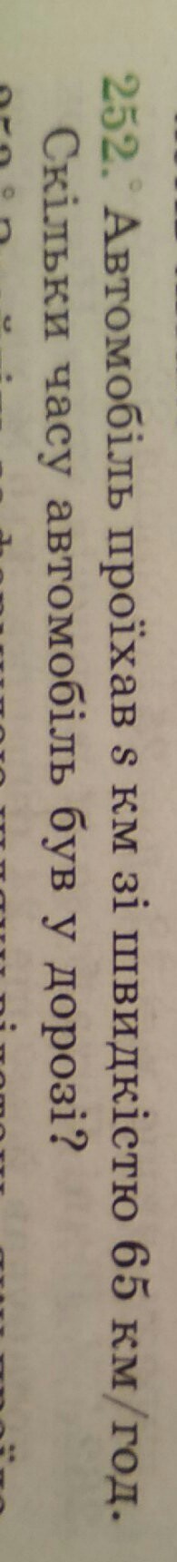 помогите ето заделать: Автомобіль проїхав s км зі швидкістю 65 км / год. Скільки часу автомобіль був у дорозі?