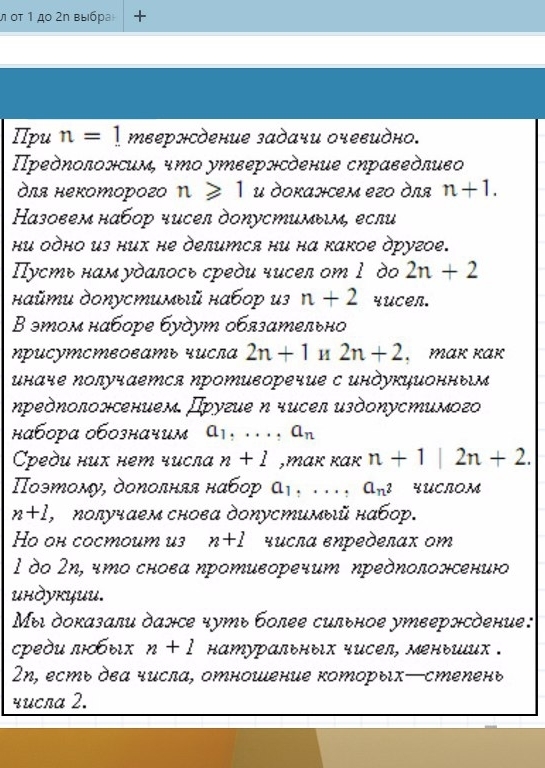 Задание: Из чисел от 1 до 2n выбрано n+1 число. Докажите, что среди выбранных чисел найдутся 2, одно из которых делится на другое