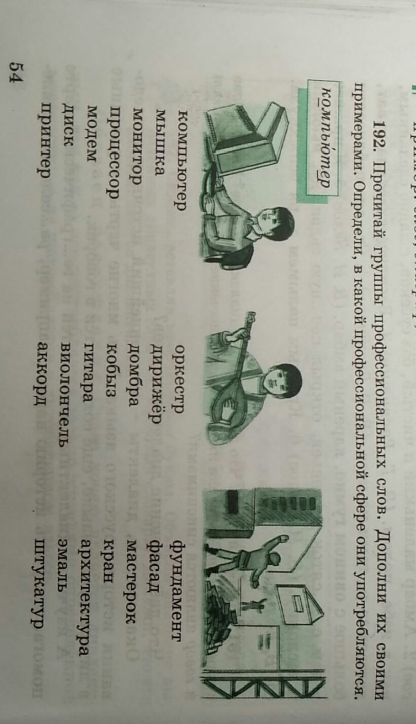 Компьютер, мышка, монитор, процессор, модем, диск, принтер, оперативная память, гигабайт, драйвер, файл, клавиатура - ПРОГРАММИСТ. Оркестр, дирижёр, домбра, кобыз. гитара, виолончель, аккорд, ноты, скрипка, фортепьяно, хор, темп - МУЗЫКАНТ. Фундамент, фасад, мастерок, кран, архитектура, эмаль, штукатур, кирпич, арматура, сварка, бетон, горелка - СТРОИТЕЛЬ.