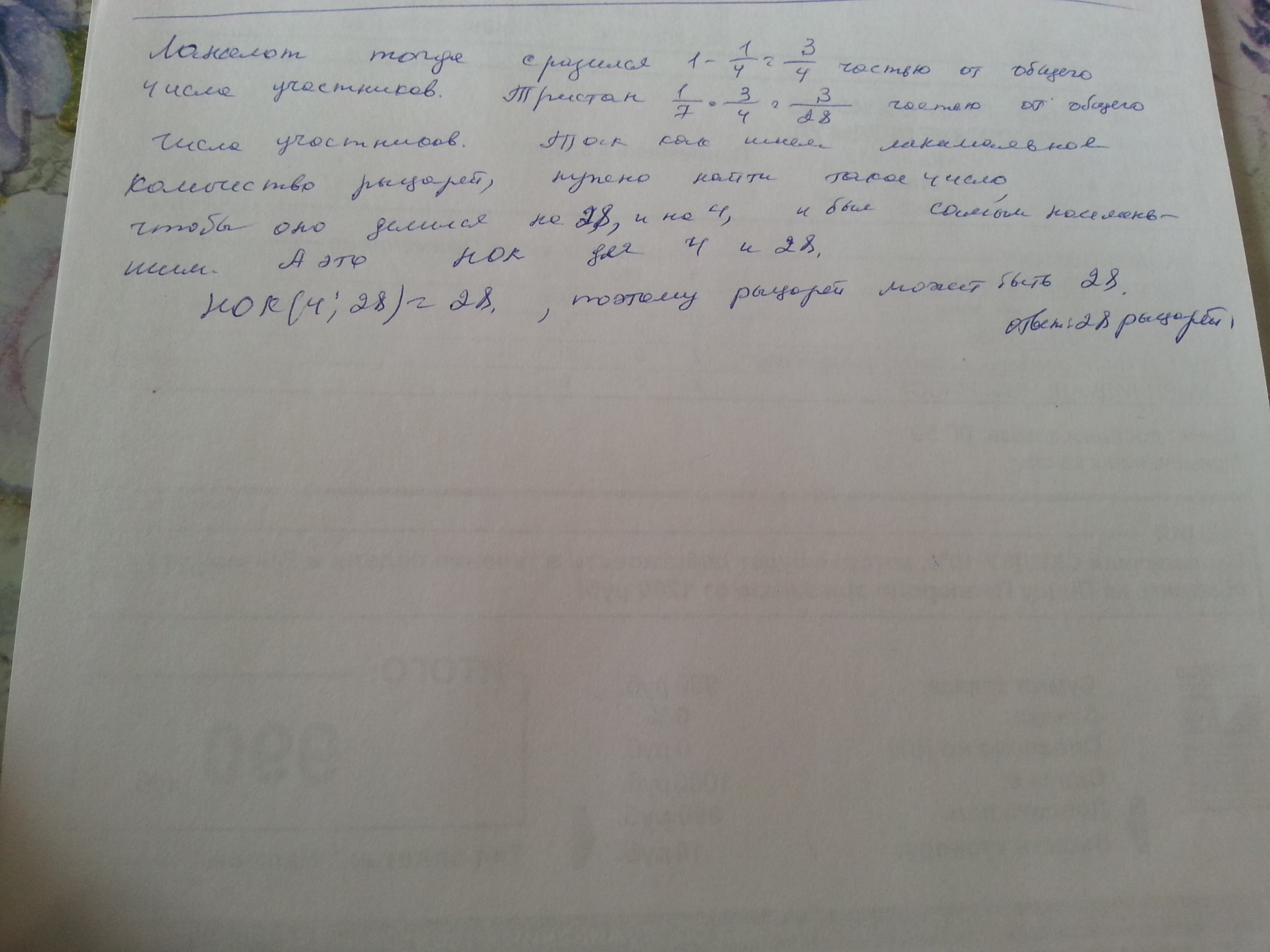 рыцарский турнир длится 7 дней.К концу 4 дня сэр Ланселот не успел сразится лишь с 1 четвертью от общего числа участников турнира. Асэр Тристан к этому сразился ровно с 1/7 из тех рыцарей,с кем успел сразиться сэр Ланселот.Какое минимальное количество рыцарей могло участвовать в турнире?