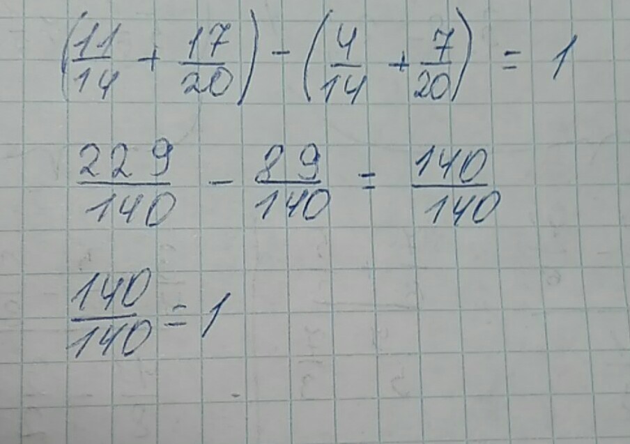 (11/14+17/20)-(4/14+7/20)=11/14-4/14+17/20-7/20=7/14+10/20=1/2+1/2=1.