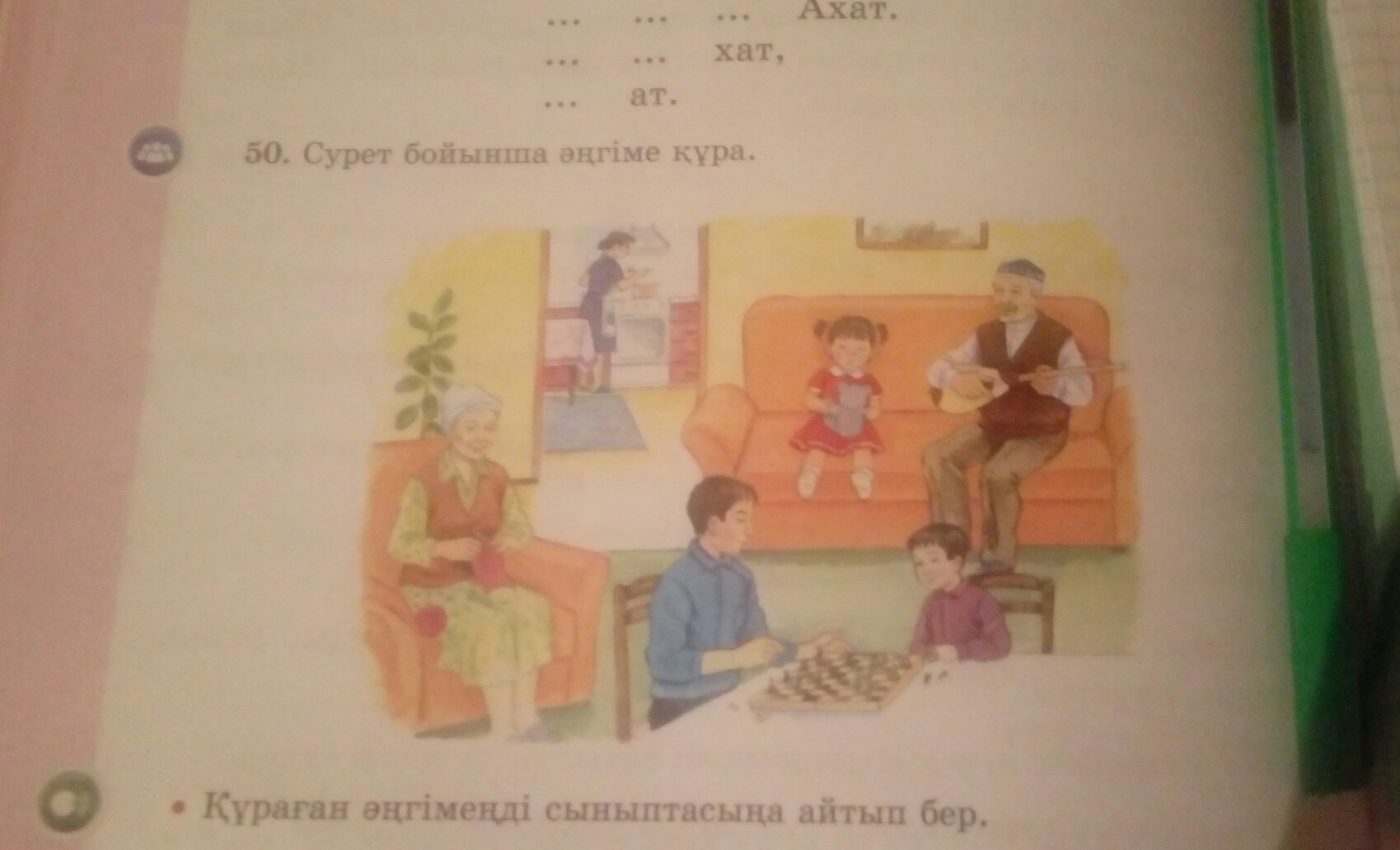 мынау менің жанұям. кешкі ас ішіп болған соң, бəріміз өз ісімізбен айналысамыз. анам ыдыс аяқ жуып жатыр. əкем екеуміз шахмат ойнағанды жақсы көреміз. əжем қарындасыма бас киім тоқып жатыр, ол тоқығанды ұнатады.атам күйші, домбыра түспейді қолынан. қарындасым əлі кішкентай, ол балабақшаға барады, ойыншықтармен ойнайды.