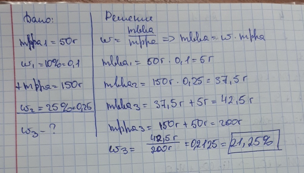 В 50 грамм 10% соленного раствора добавили 150 грамм 25% того же самого раствора, Какая часть массы W соли получили в растворе