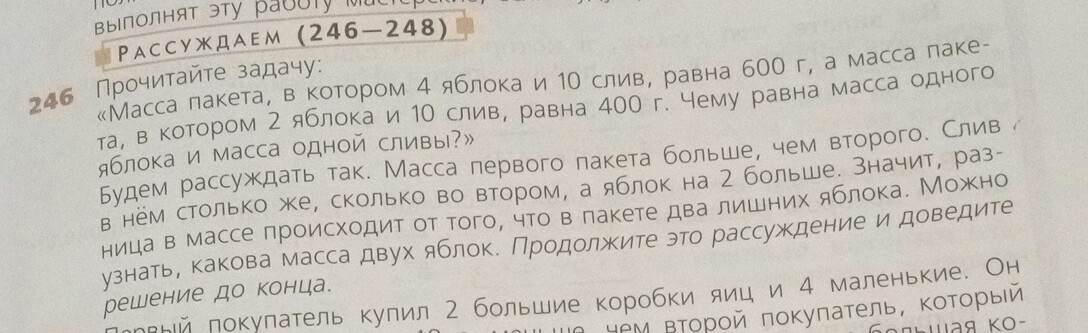 Масса пакета в котором 4 яблока и 10 слив, равно 600 г, а масса пакета в котором 2 яблока и 10 слив, равна 400 г. Чему равна масса одного яблока и масса одной сливы?