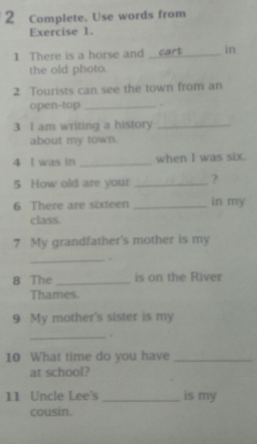 Помогите сделать номер 2.Нужно использовать слова:bus,grandparents,project,horse,primary school,cart,lesson,van,uncle,great-grandmother,pupil,break,son,aunt,boat,cousin.