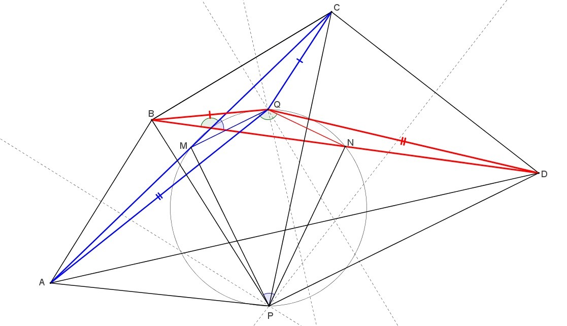 Аналогично, треугольники APC и BPD совместятся поворотом вокруг точки Р, т.е., ∠MPN между их медианами РМ и РN тоже равен углу между диагоналями четырехугольника. В любом случае, получаем либо ∠MPN=∠MQN, либо ∠MPN+∠MQN=180°, что и означает, что точки PQМN лежат на одной окружности.