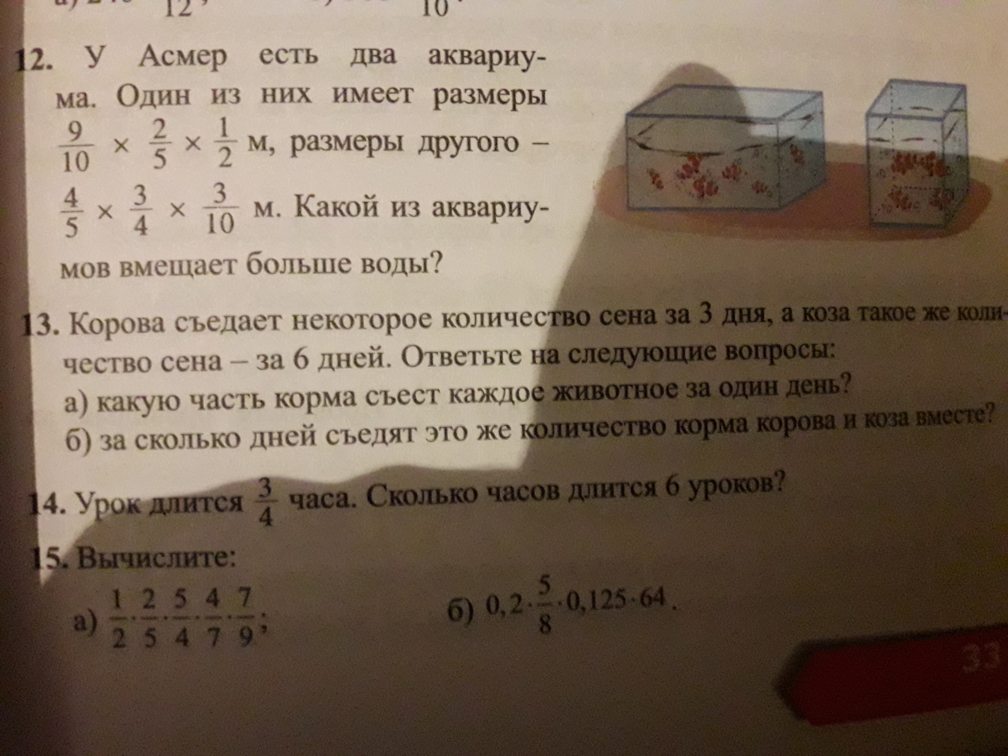 2) 4/5 * 3/4 * 3/10 = (4*3*3)/(5*4*10) = 9/50 (куб.м) - вместимость другого аквариума.