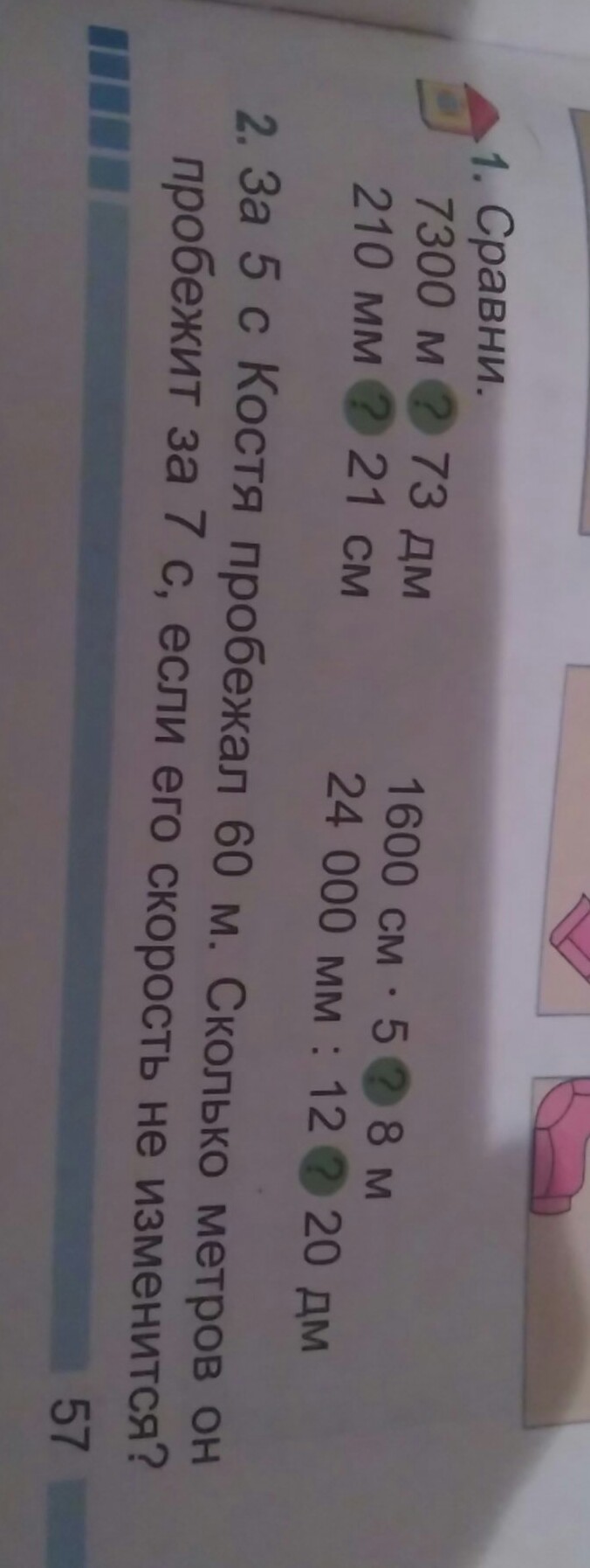 1 Сравни: 1. 7300м больше чем 73 дм. 2. 210мм = 21 см. 3. 1600 см * 5 больше чем 8 м. 4. 24 000 мм / 12 = 20 дм. 2 Задача: 1) 60 / 5 = 12 (м) - пробежит Костя за 1 с. 2) 12* 7 = 84 (м) - пробежит Костя за 7 с.