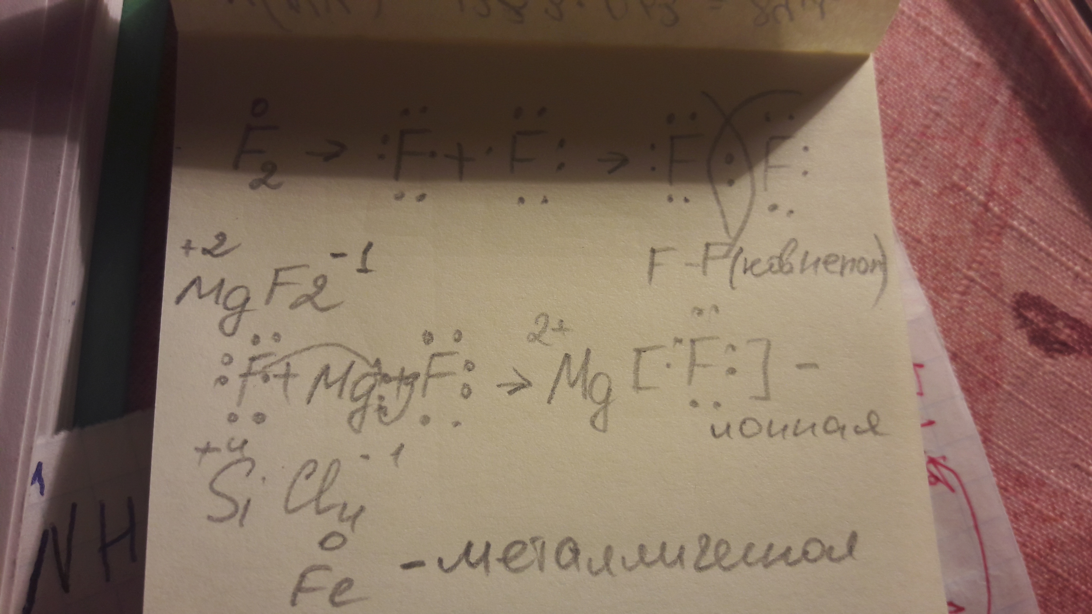 Определите вид химической связи, покажите образование связи схематически, степени окисления элементов и валентности элементов для следующих веществ: F2, SiCl4, MgF2, Fe