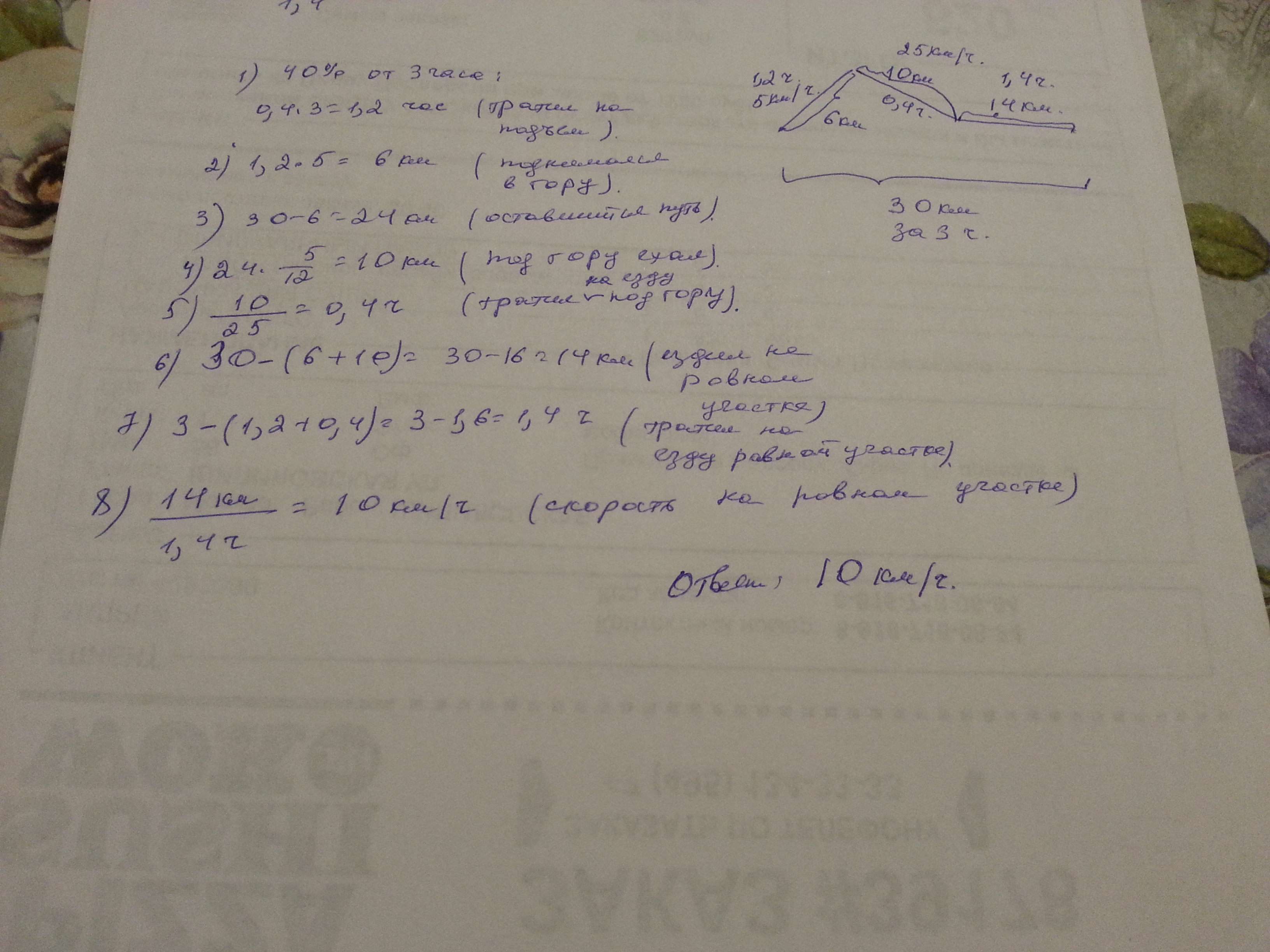 Велосипедист проехал 30 км за 3 часа. 40% времени он поднимался в гору со скоростью 5 км/ч, а 5/12 оставшегося пути ехал под гору со скоростью 25 км/ч. Какова была скорость велосипедиста на ровном участке?.