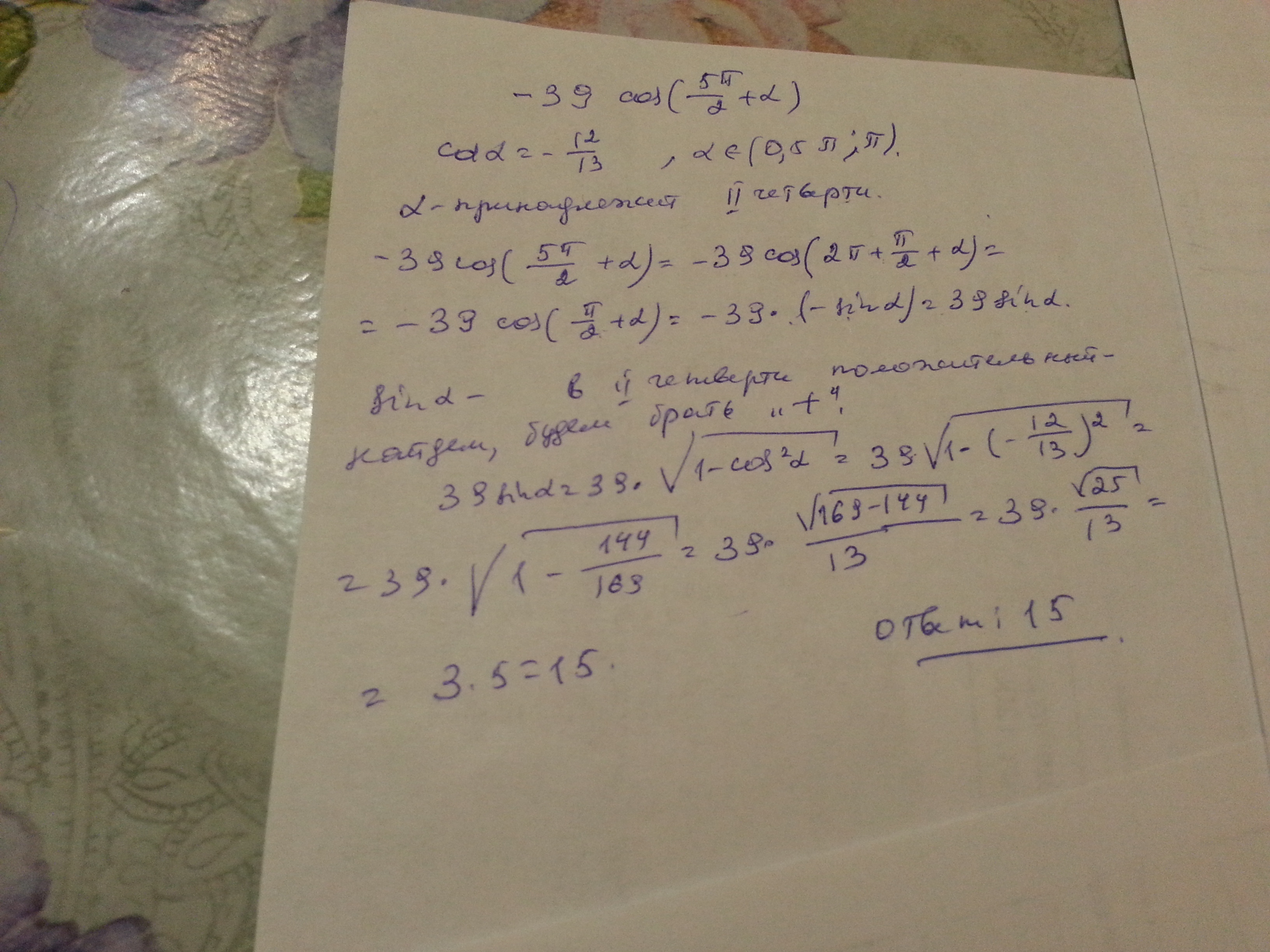 α∈(0,5π;π) ⇒ sinα>0