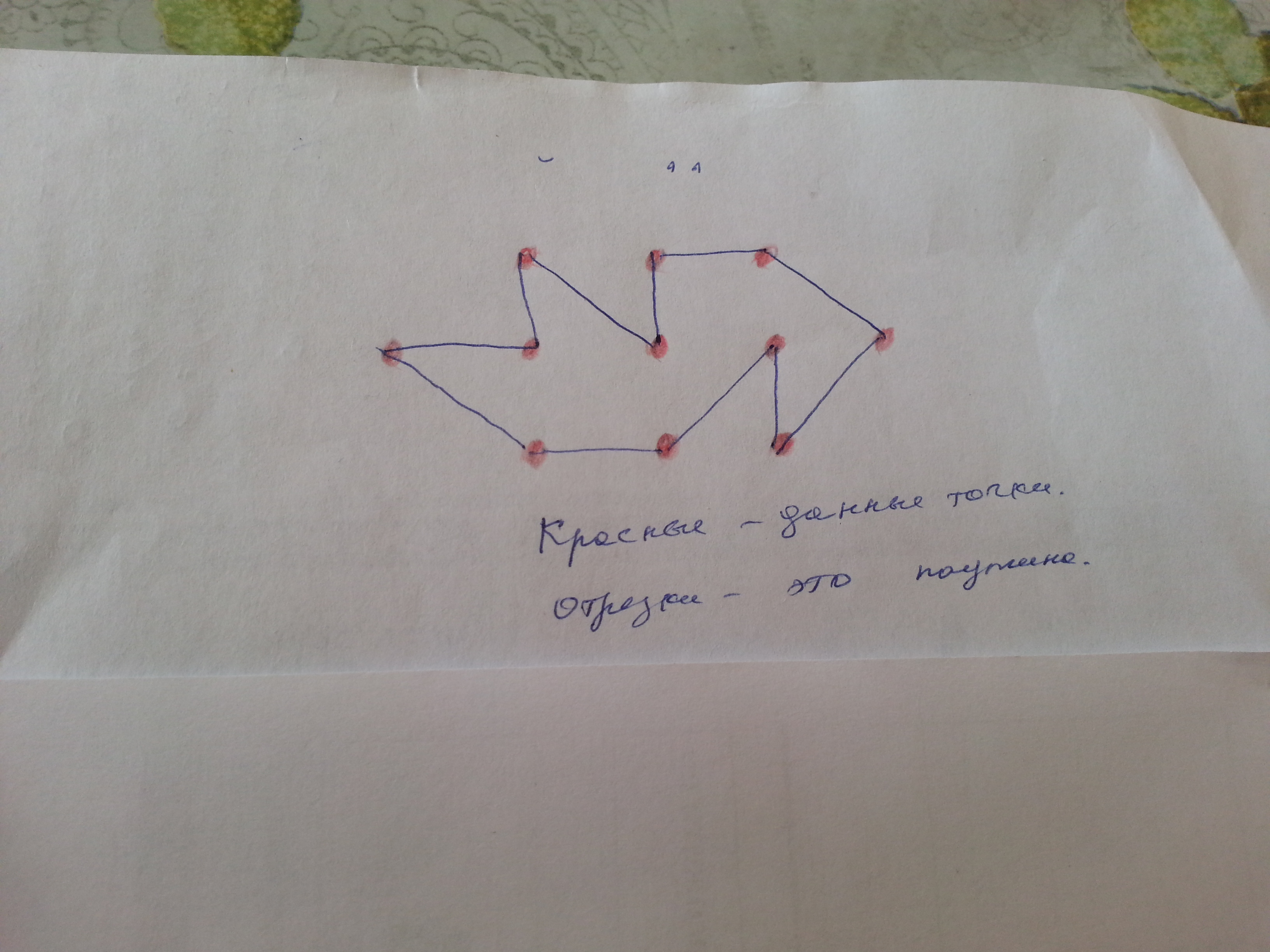 Паучок-ученик натянул паутину между 11 точками так,чтобы его паутинки нигде не пересикались,и в конце вернулся ьв исходную точку.Паук-учитель его похвалили,но натянивают <<правильную>> паутину, у которой никакие отрезки не лежат на одной прямой.Помогите пацчку соеденить все 11 точек на рисунке >>правильной<< паутиной