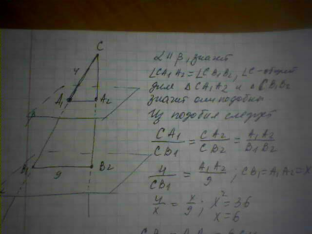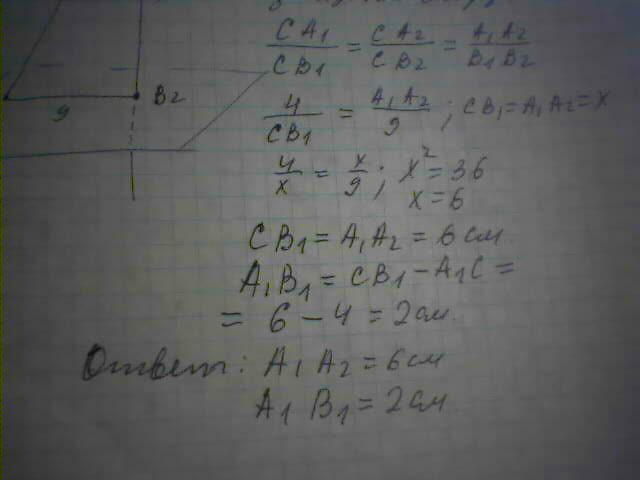 Через точку С, не принадлежит двум параллельным плоскостям и, проведены два луча, один из которых пересекает плоскости и в точках А1 и В1 соответственно, а второй - соответственно в точках А2 и В2. Известно, что СА1 = 4 см, В1В2 = 9 см, А1А2 = СВ1. Найдите А1А2 и А1В1.