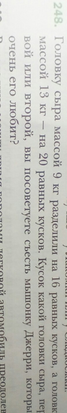 1 головка сыра будет весить 9/16 кг, а второй 13/20 кг. домножим 9/16 на 5 и будет 45/80, а второн домножим на 4 и выйдет 52/80. те есть второй кусок сыра больше, по этому пусть Джери жрёт второй кусок.