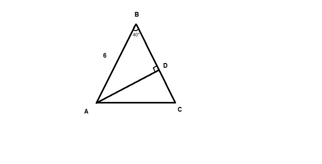 В треугольнике ABCAB=BC=6,∠B=40∘. Найдите высоту AD. Ответ округлите до целых.